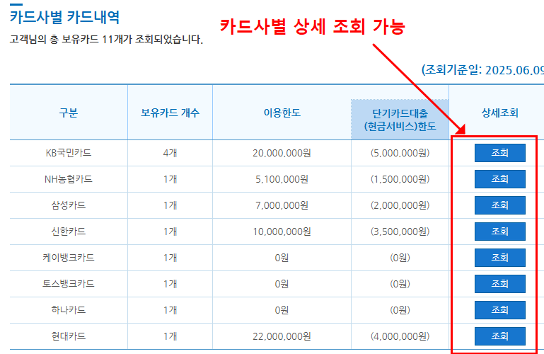 | 카드내역 조회 | 사용 중인 카드, 자동이체 여부 확인 |