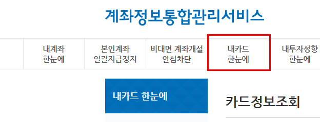 - 핵심 메뉴 진입: “내계좌한눈에”와 “내카드한눈에” 항목 선택