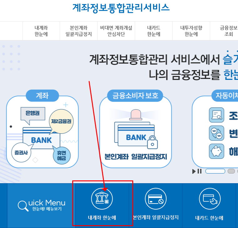 - 내계좌한눈에, 내카드한눈에, 휴면예금·보험금, 자동이체 관리 등 금융정보를 한번에 확인할 수 있는 서비스입니다