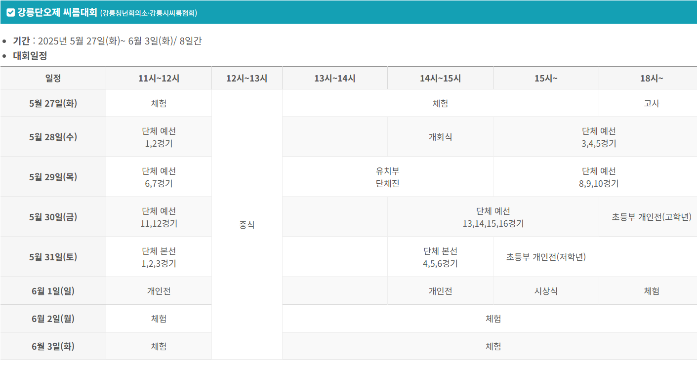 - 씨름 대회: 5월 27일 ~ 6월 3일, 단오장 씨름장