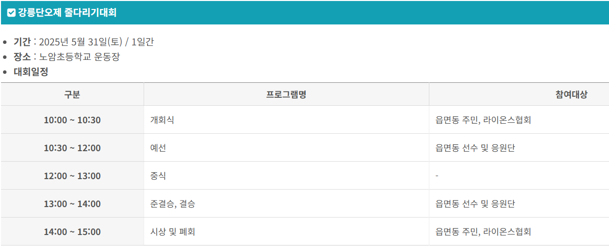 - 줄다리기 대회: 5월 31일, 노암초등학교 운동장