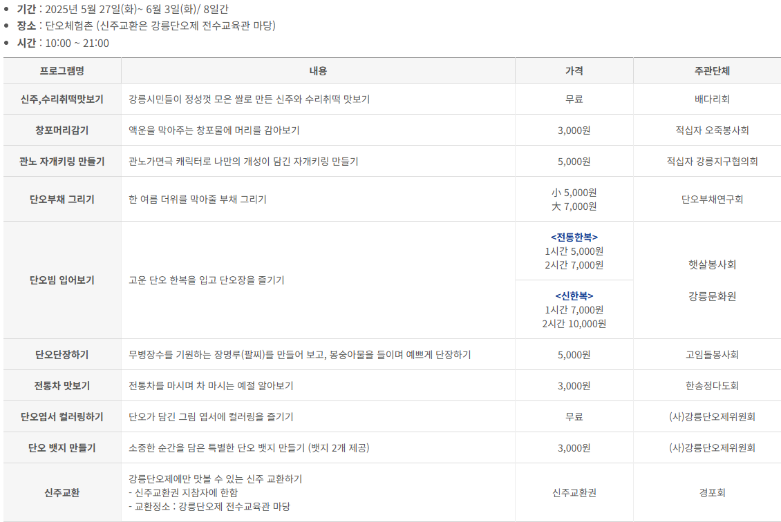 | 단오한복 입어보기 | 전통/신한복 입고 단오장을 체험 | 전통: 5천~7천원 / 신한복: 7천~1만원 | 햇살봉사회, 강릉문화원 |