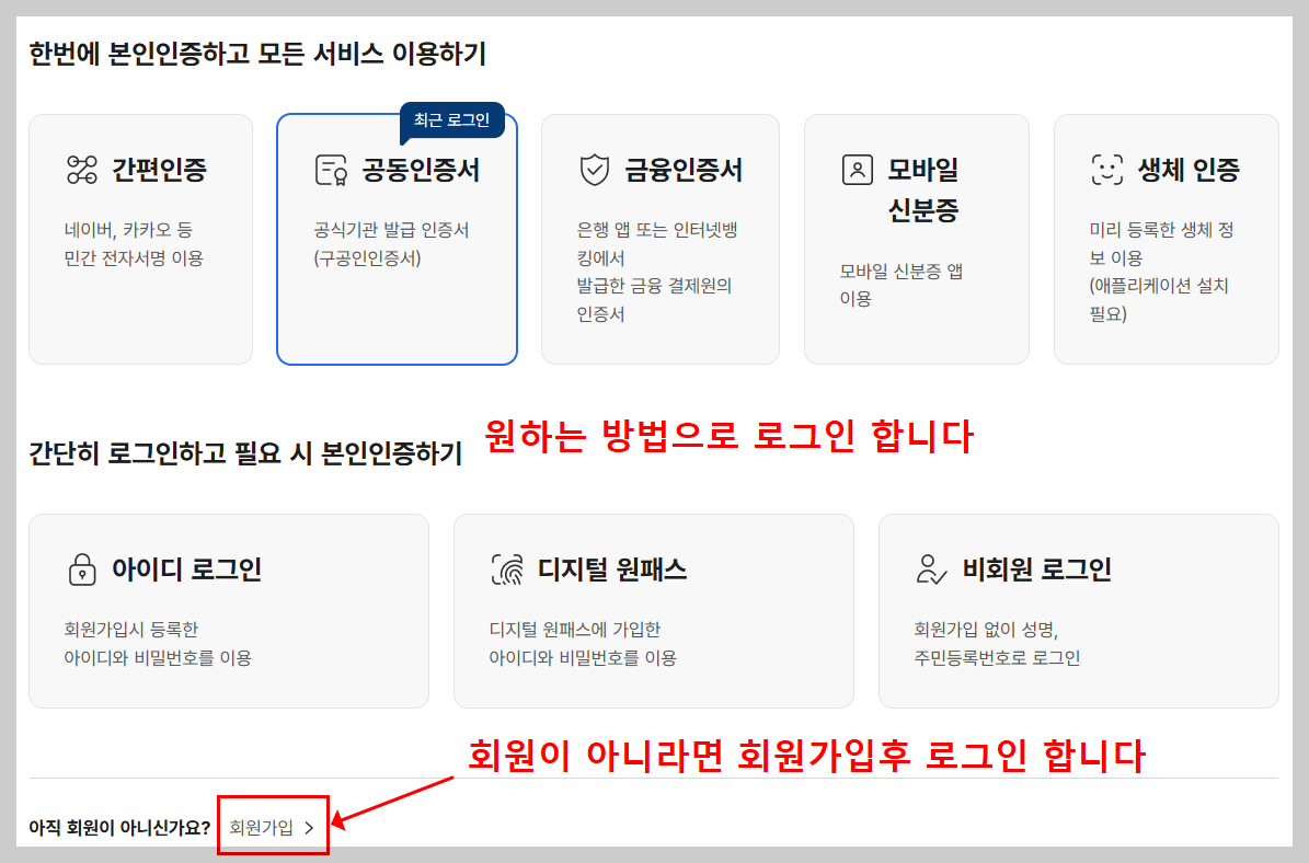 - 공동인증서 또는 간편인증