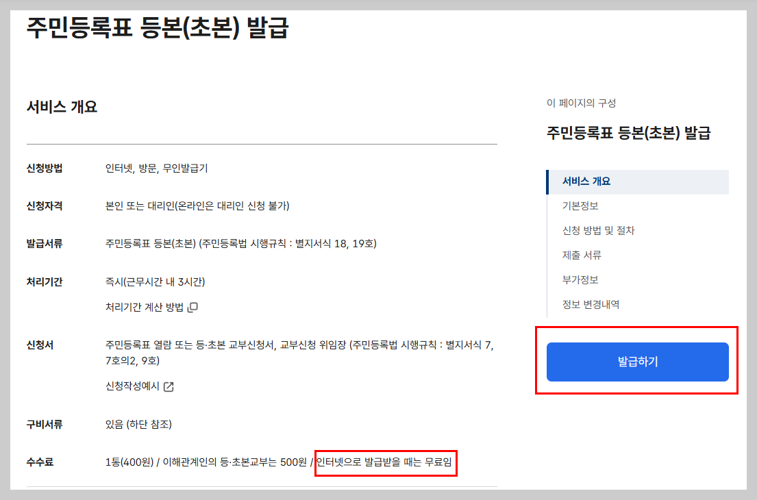 💳 주민등록등본 발급 수수료 안내