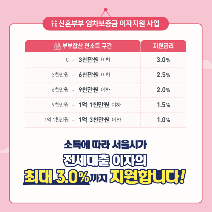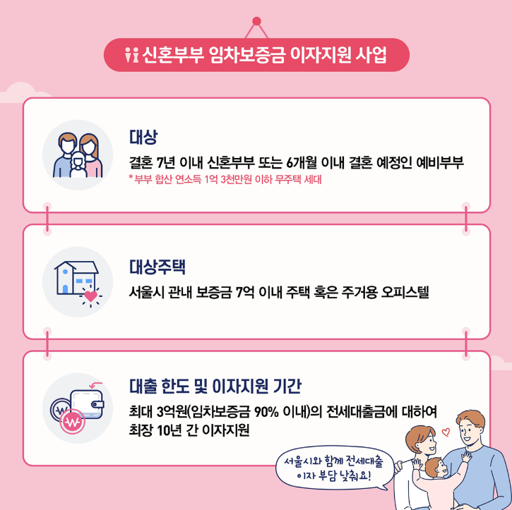 “결혼했는데 살 집이 걱정이라면? 서울시가 최대 3억까지, 이자 최대 연 4.5%까지 지원해줍니다!”