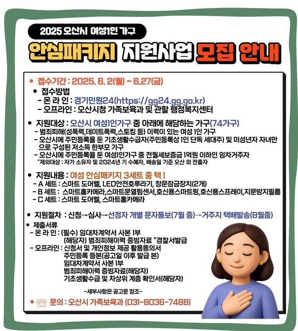 여성 혼자 사는 가구, 특히 1인 가구에게 안전은 선택이 아닌 필수입니다. 혼자 사는 여성들의 불안감을 덜어주고, 실질적인 방어 수단을 제공하기 위해 경기도에서는 매년 ‘여성안심패키지’ 지원사업을 시행하고 있습니다. 2025년에도 오산시, 안양시, 군포시, 수원시, 화성시를 포함한 경기도 전역에서 ‘여성안심패키지’를 받을 수 있는 기회가 열렸습니다.